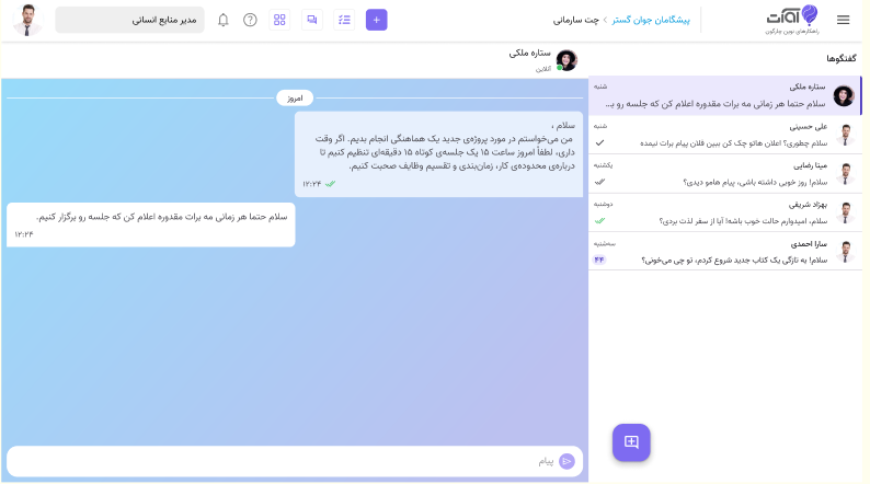 چت سازمانی آوات، بستری امن و یکپارچه برای ارتباطات تیمی فراهم میکند. گفتگوهای کاری، هماهنگیهای روزمره و تبادل اطلاعات در یک فضای سازمانی متمرکز انجام میشود تا بدون پراکندگی در ابزارهای مختلف، همکاری تیمی سریعتر و شفافتر پیش برود.